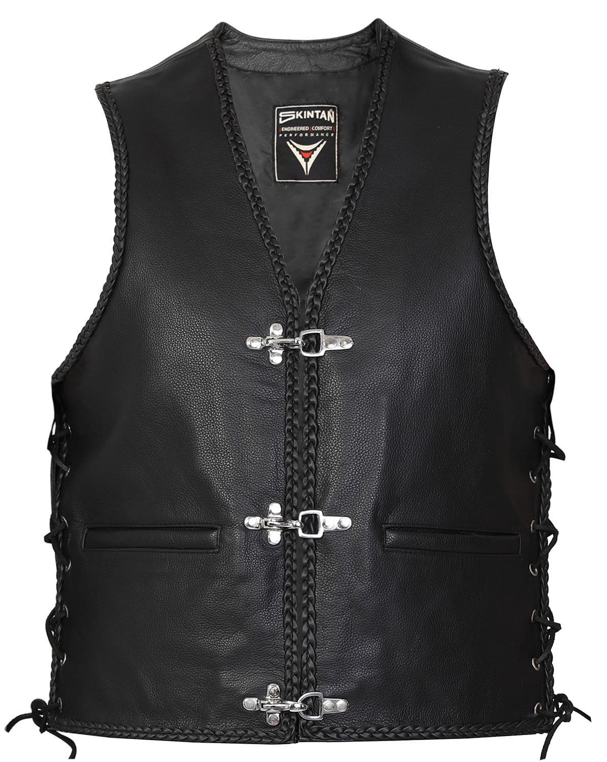 Braided leather waistcoat with fish hook buckle fasteners crafted from quality top-grain cowhide.